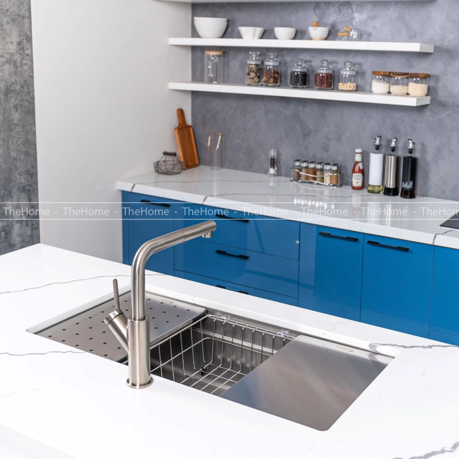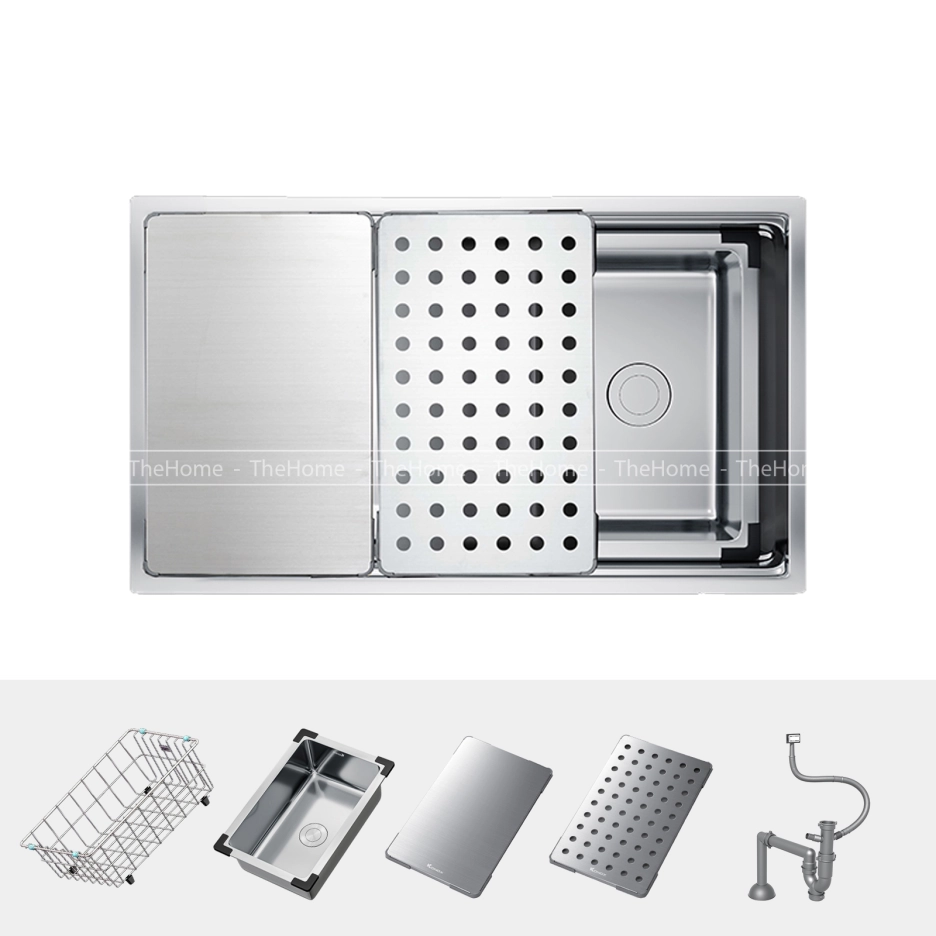 - Thiết kế hiện đại với gờ hạ bậc – tích hợp phụ kiện thông minh: Siphon, giá úp bát inox, chậu rửa nhỏ, thớt inox, thớt inox lỗ