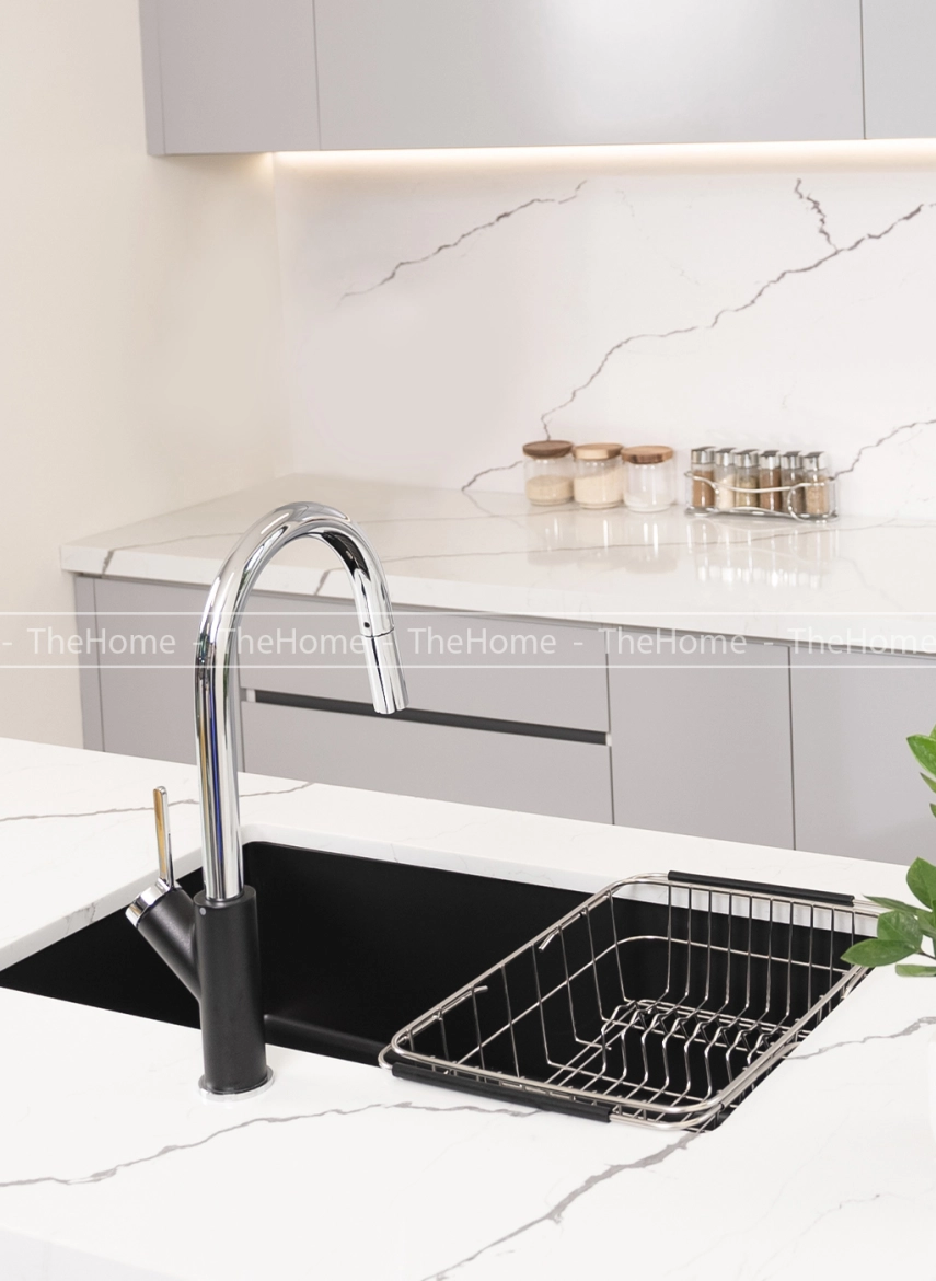 - Thiết kế vát cạnh tinh tế giúp dễ dàng lau chùi và mang lại vẻ đẹp cao cấp cho căn bếp.