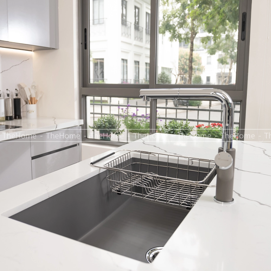 - Thiết kế vát cạnh tinh tế giúp dễ dàng lau chùi và mang lại vẻ đẹp cao cấp cho căn bếp.