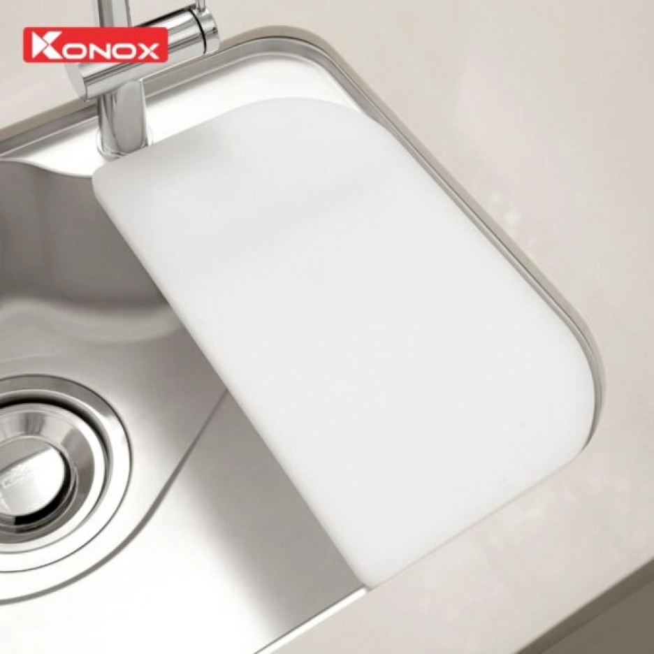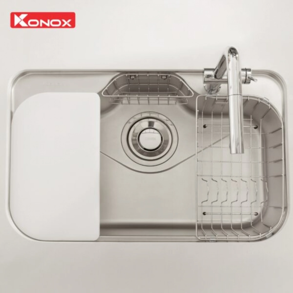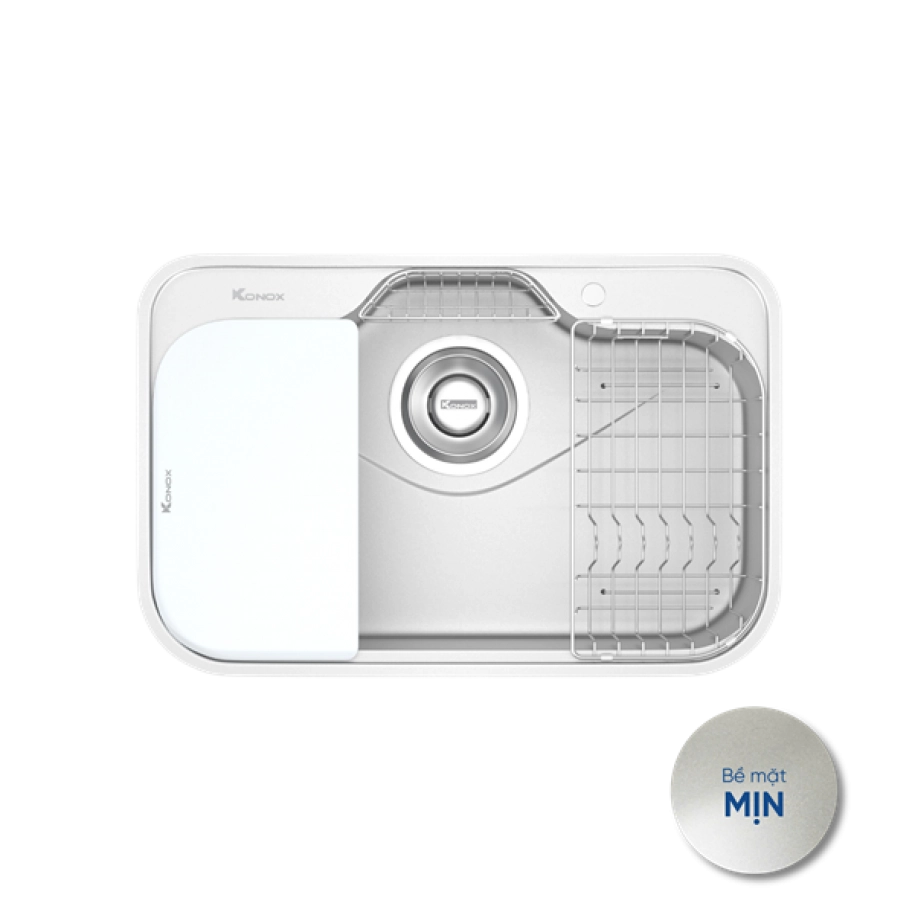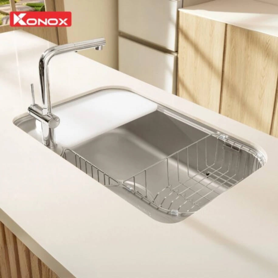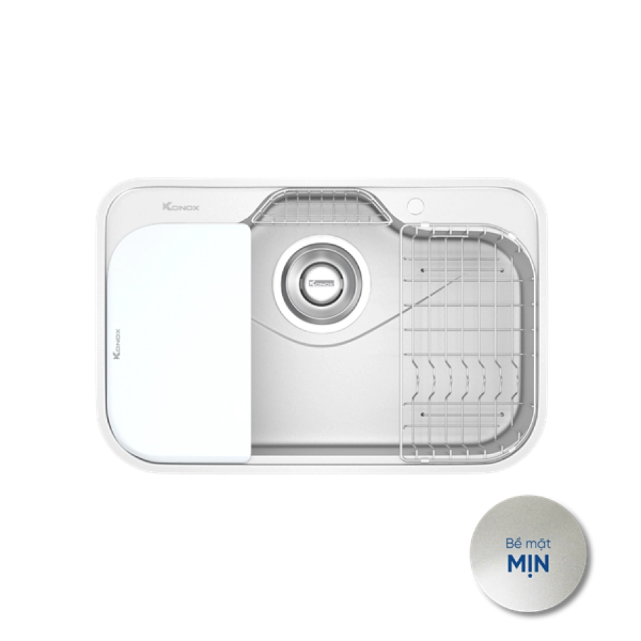 - Tích hợp phụ kiện thông minh: Thớt nhựa, rổ phụ, giá úp bát, siphon.