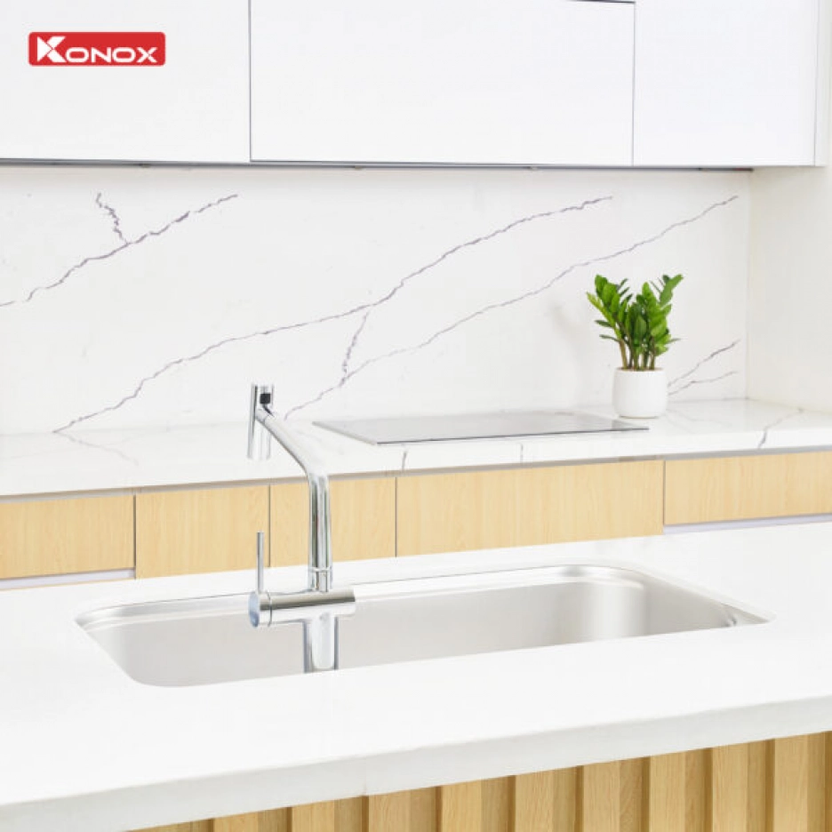 Với model Tari 9051SM, Konox ra mắt công nghệ xử lý bề mặt trơn mịn sở hữu độ bền, khả năng chống ăn mòn lý tưởng, an toàn với sức khỏe và 100% có thể tái chế, giữ vững độ bền và thẩm mỹ theo thời gian. Tari 9051SM với thiết kế bo tròn giúp dễ vệ sinh, đồng thời tạo cảm giác nhẹ nhàng, hài hòa trong tổng thể không gian.