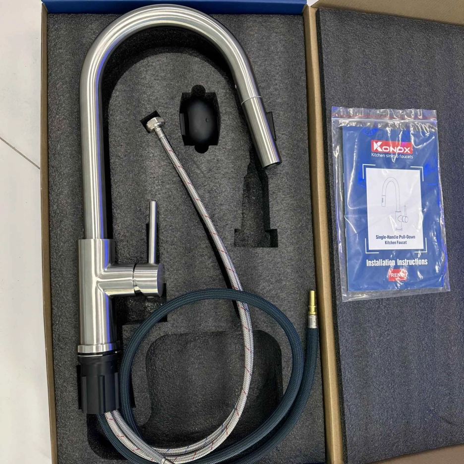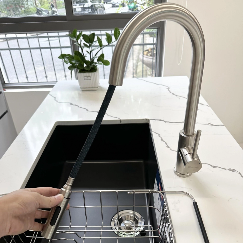 – Chức năng: Nóng lạnh + Rút dây + Đầu vòi khớp xoay + 2 chức năng Sprayer (Dòng chảy phun mưa, tạo bọt khí) + Xoay 360 độ